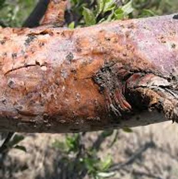 Diseases infecting woody material are much more damaging than those infecting leaves. Diseases that infect the woody material usually exhibit signs on the tree as bark discoloration, bark deformation, or resin exuding from the wood, (as shown above.) These cause twig die back leading to branch die back or even tree mortality. Root infections will also show a combination of these signs and symptoms.